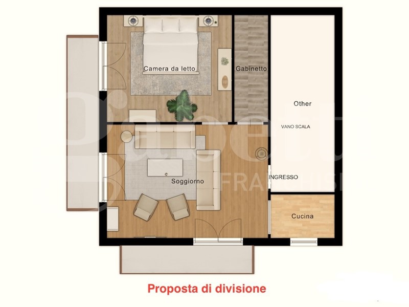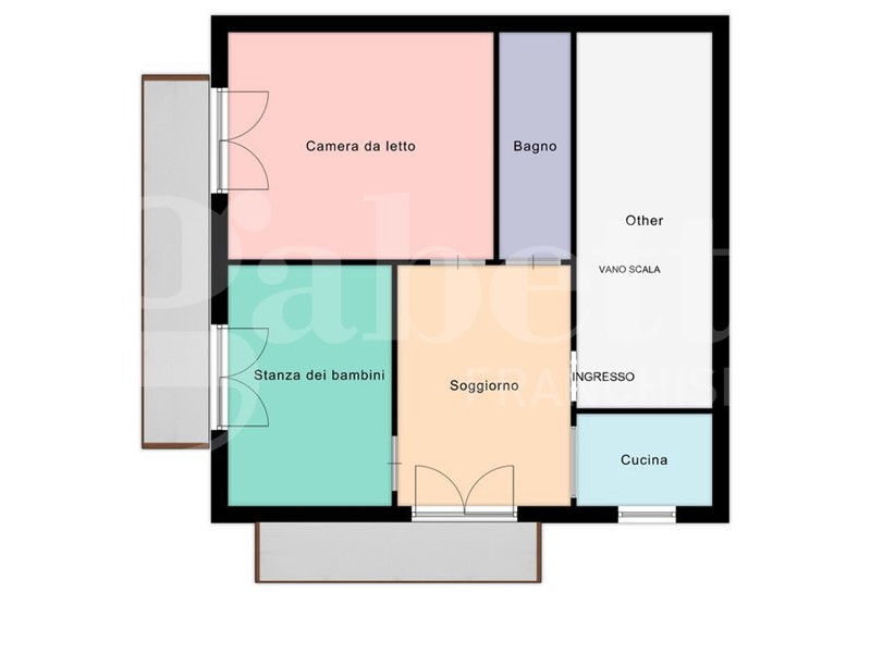 L'immobile apre su una zona giorno con balcone, cucinino con finestra, due camere da letto con balcone e bagno finestrato.