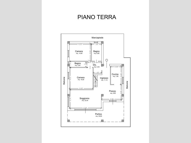 Il piano terra ospita la zona giorno con soggiorno, sala da pranzo, cucina, due camere da letto e due bagni, oltre a un ampio portico esterno e un balcone perimetrale che abbraccia l'intera casa. Al piano superiore, una camera aggiuntiva, un bagno e un terrazzo panoramico.