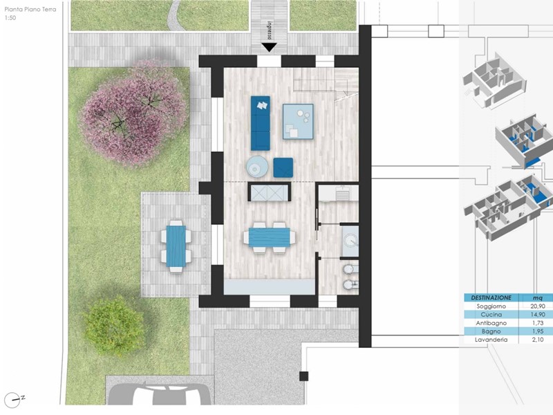Al piano terra ti accoglie una luminosa zona giorno open space con cucina, lavanderia e bagno di servizio. Gli spazi esterni sono pensati per essere vissuti: corte pavimentata, angolo gazebo e posto auto, tutto perfettamente organizzato per il massimo comfort.