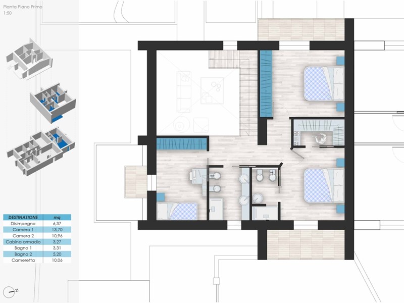 Al piano superiore si sviluppa la zona notte, composta da una camera padronale con cabina armadio e bagno privato, una seconda camera matrimoniale, una cameretta singola e un ulteriore bagno. Tutte le stanze sono dotate di balcone.
