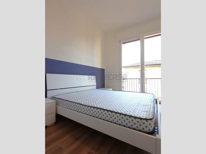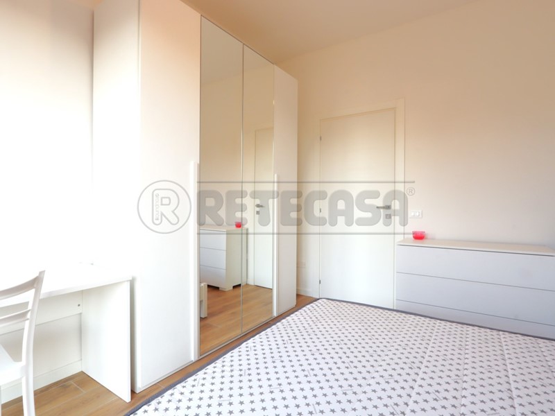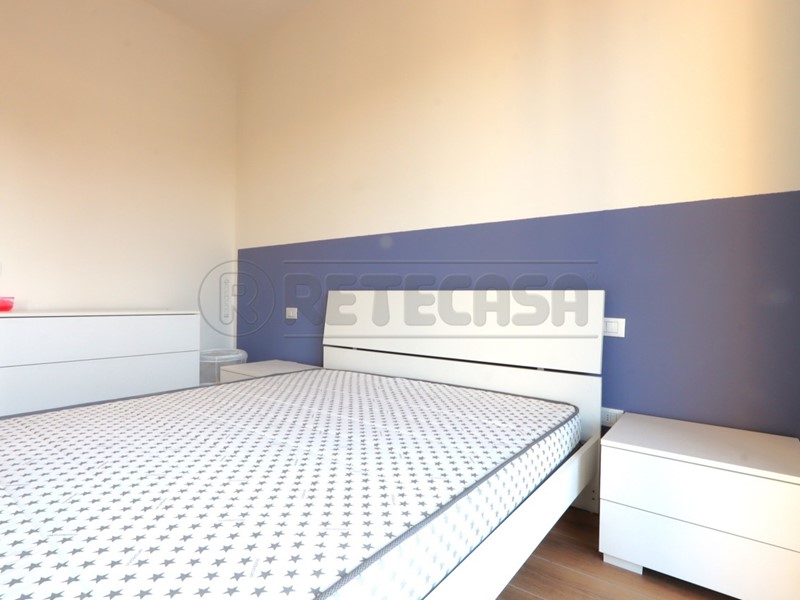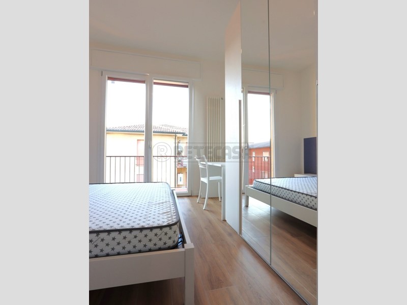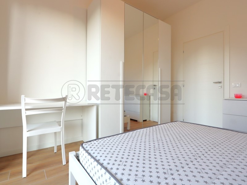 La camera disponibile è una matrimoniale arredata con letto contenitore, comiodini, armadio a 4 ante, comò, scrivania e sedia con accesso a terrazzo esclusivo ad € 460/mese.