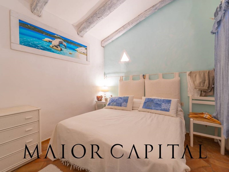 Attraverso una porta a vetri si accede agli interni, dove ad accoglierci troviamo un soggiorno luminoso e arioso, decorato nei toni del mare e ispirato allo stile semplice e autentico delle casette costiere sarde. A catturare lo sguardo è lelegante soffitto con travi in legno a vista, che conferisce profondità e personalità allambiente. Un disimpegno conduce alla zona notte, composta da due camere matrimoniali, entrambe arredate con gusto e impreziosite dalle delicate sfumature del celeste e dellazzurro, che richiamano il paesaggio marino circostante.