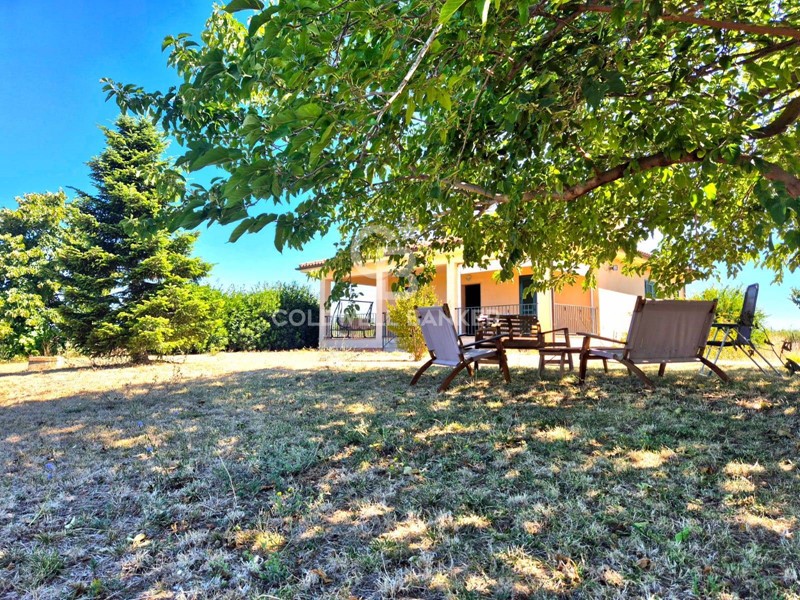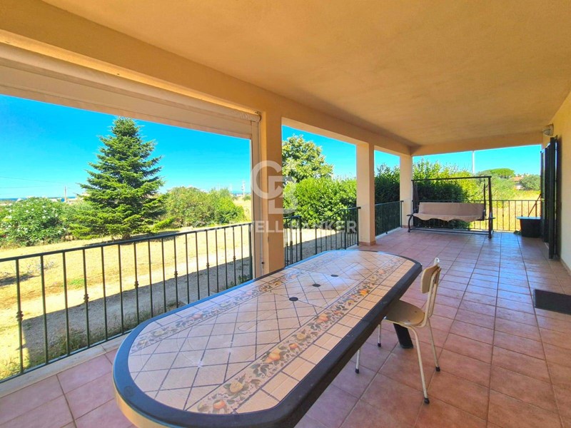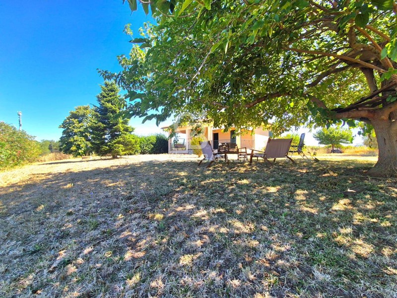 Una villa unifamiliare in ottimo stato, tutta in stile rurale e perfettamente integrata nel contesto verde e naturale in cui si trova, con ottime finiture, sviluppata interamente al piano terra, composta di 3 camere, ripostiglio, 2 bagni, cucina con camino, soggiorno e grande portico esterno con vista mare. Al piano interrato è presente un magazzino grandissimo, accessibile da rampa carrabile ed ovviamente già dotato di energia elettrica, dove è presente anche una riserva idrica da 2000 litri.