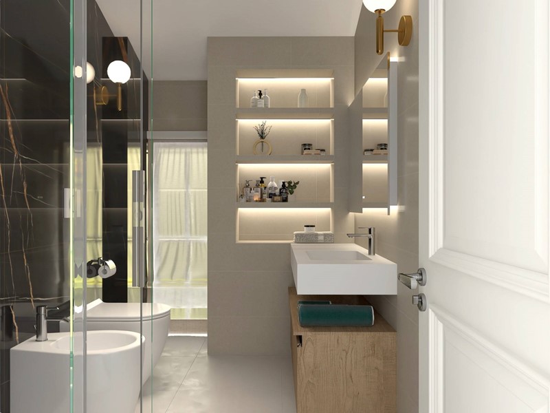 un bagno elegante e finestrato (zona notte) e un wc di servizio con antibagno utilizzabile come zona lavanderia (zona giorno).