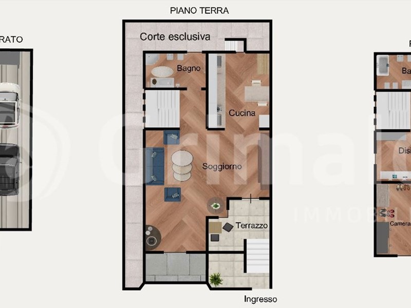 Il piano seminterrato ospita una comoda autorimessa e un garage doppio, perfetti per auto, moto, bici e spazio extra per riporre tutto ciò che serve.