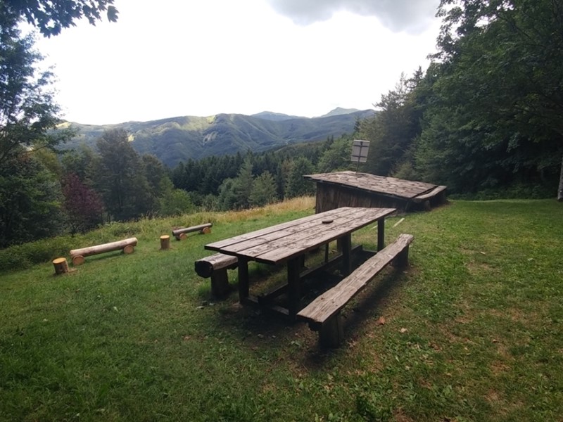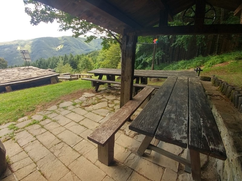 Il giardino in prossimità è a arricchito da: barbecue in pietra, sedute e tavolate in legno oltre che da un manufatto dove è stato ricavato un bagno di servizio, lo stesso funge anche da cantina e vi è alloggiata la cisterna di cui sopra. Da questa superficie in piano a mezzo di sentiero ai cui lati si trova una preziosa coltivazione di lamponi spontanea si raggiunge in pendenza uno spiazzo carrabile dove si trova una “eventuale” baracca in legno uso rimessa, baracca dotata di luce ed acqua.