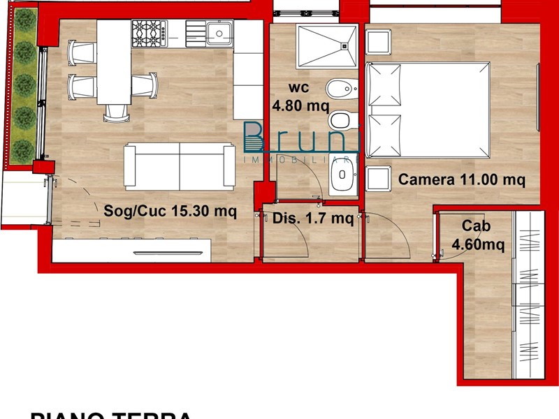 Composto da: ingresso su soggiorno con angolo cottura, una camera da letto matrimoniale, un bagno con finestra e doccia spaziosa, oltre a piccola corte esterna.