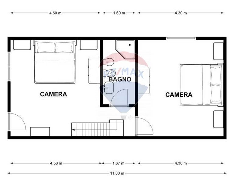 Percorrendo la scala interna raggiungiamo poi le camere matrimoniali e il bagno dotato di doccia.
