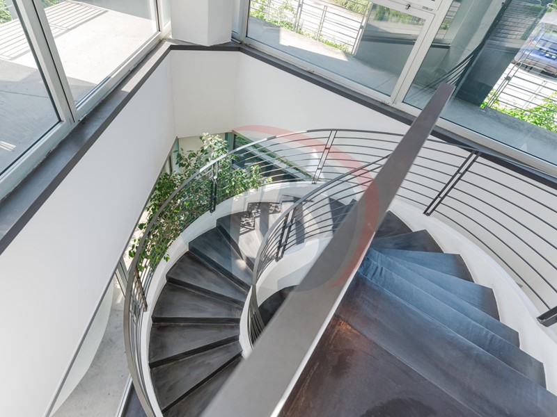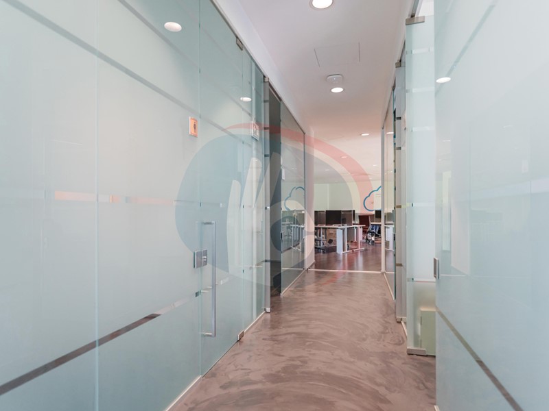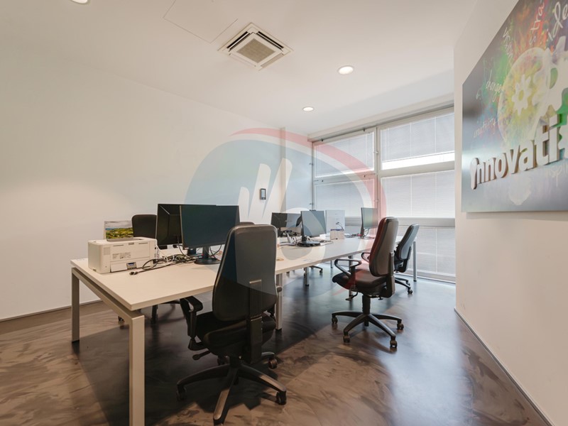Le ampie superfici vetrate conferiscono straordinaria luminosità naturale agli ambienti interni, creando spazi di lavoro accoglienti, funzionali e di grande impatto estetico.