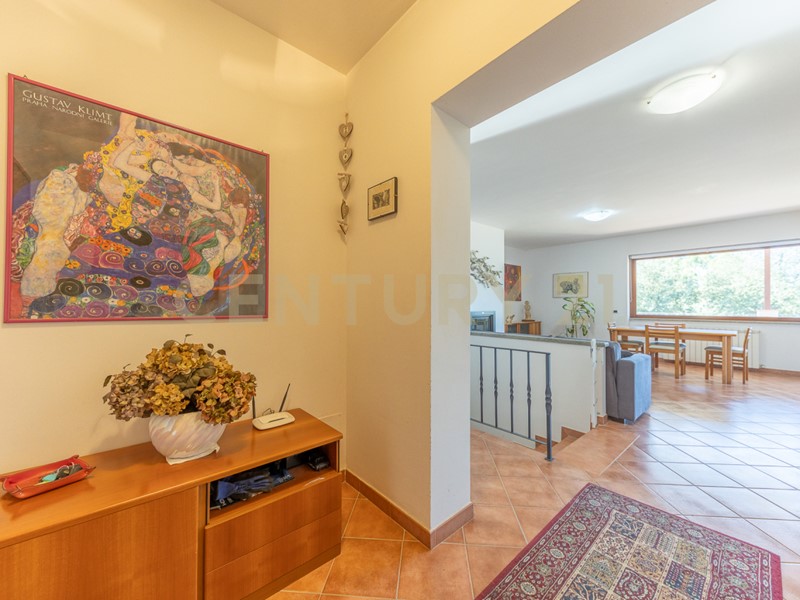 All’interno, il salone triplo si distingue per le grandi finestre con infissi in legno e doppio vetro camera, che incorniciano il verde circostante come quadri naturali, donando a ogni ambiente luce e respiro.