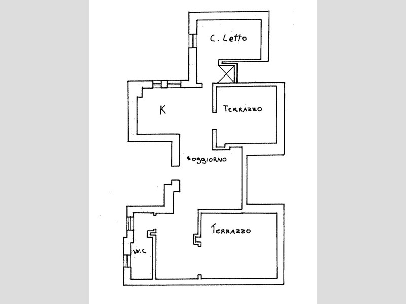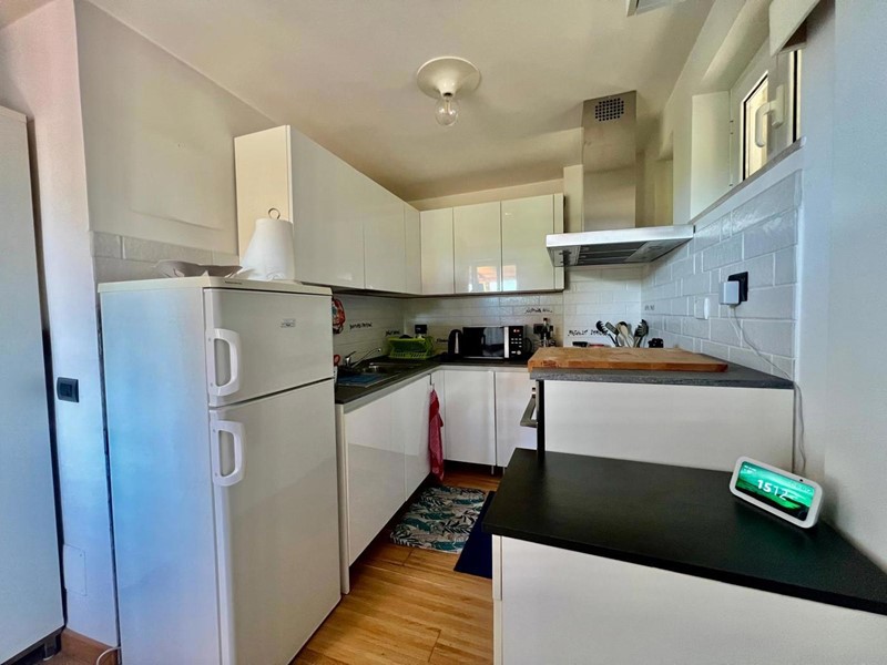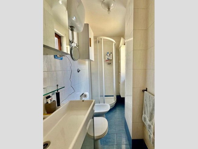L'immobile di circa 75 mq è composto da soggiorno con cucina a vista e zona pranzo, camera matrimoniale, servizio con doccia, due terrazzi, uno di circa 20 mq e l'altro di circa 15 mq. In buone condizioni è dotato di pavimenti in parquet e ceramica, finestre in legno con persiane in metallo, riscaldamento autonomo e aria condizionata.