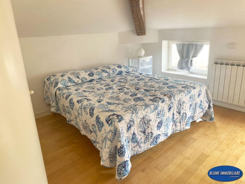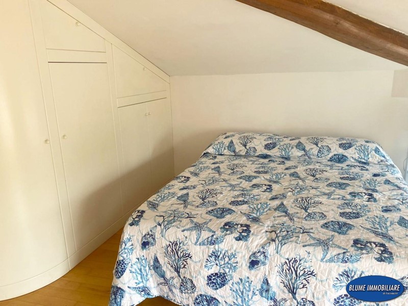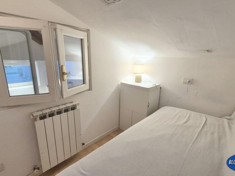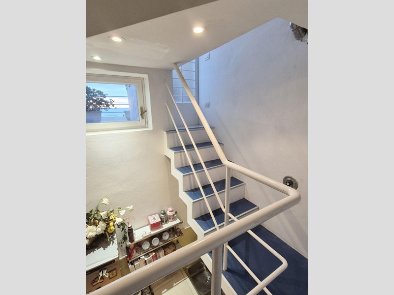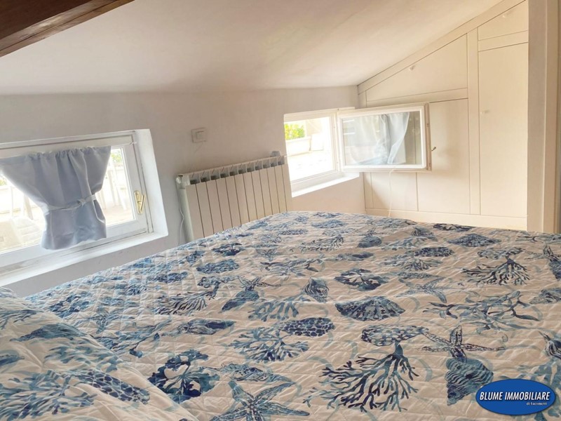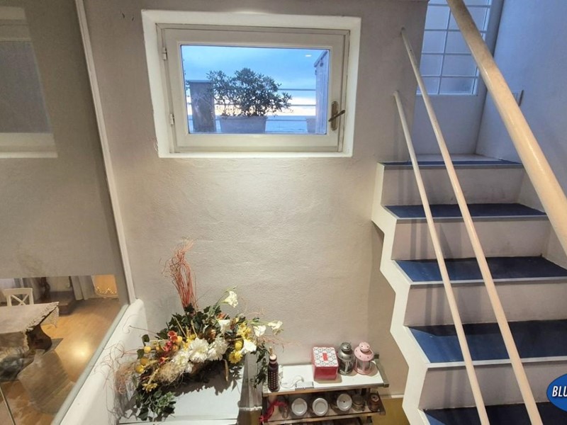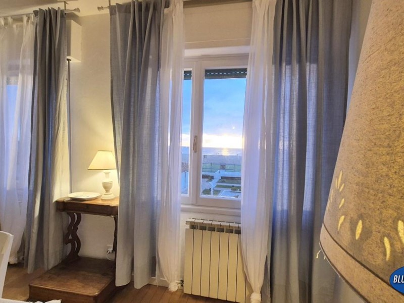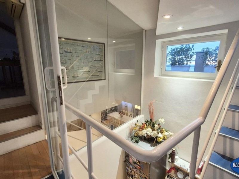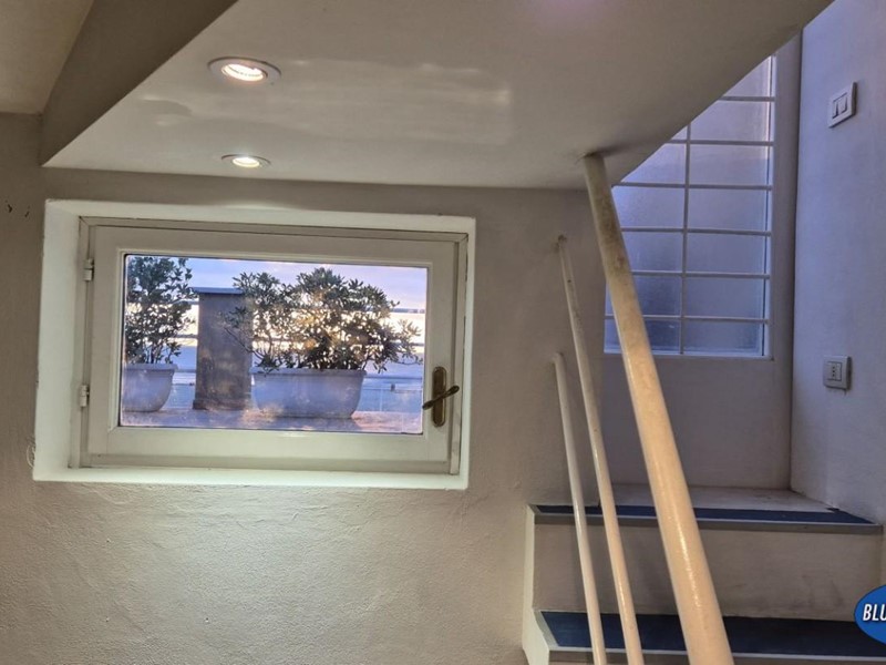 Le rifiniture sono molto particolari, sembra di essere sopra una nave, con ringhiere in metallo, pavimenti in legno, finestre che guardano il mare e lo spettacolo del tramonto, sia dalla zona giorno che dalle camere e naturalmente dalla terrazza, è veramente unico. Si compone di ingresso con attiguo cucinotto, un bagno con vasca ed una grande sala doppia fronte mare, dotata di finestre sui due lati, prima della ristrutturazione la sala era divisa e una parte era adibita a camera, che naturalmente si può ripristinare se occorre. Dalla sala si accede ad una camera, sempre fronte mare. Una bella scala in metallo e legno, permette l'accesso al piano mansardato dove troviamo una camera, al momento utilizzata anche come studio, con armadi a muro e finestre a parete, attigua cameretta e poi l'accesso alla terrazza di oltre 30 mq. con vista mare.