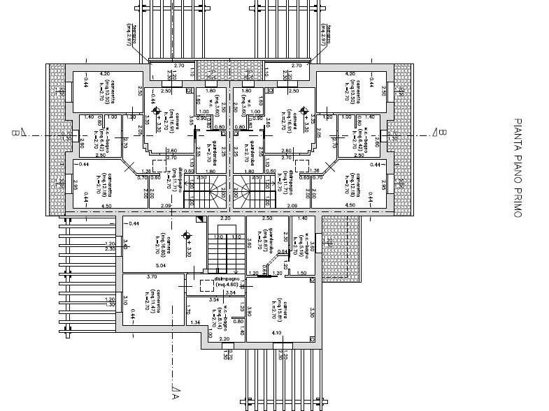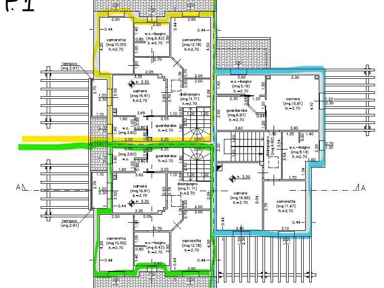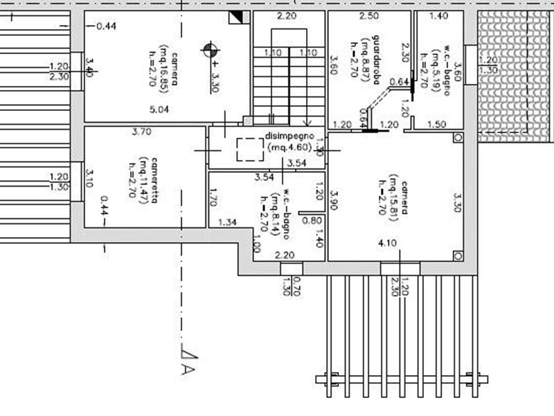 - Primo piano: due camere matrimoniali (una con guardaroba), una cameretta, un disimpegno e un bagno.