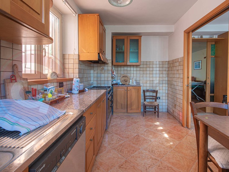 Al piano rialzato, la casa si apre su una cucina abitabile con camino, perfetta per le serate invernali e per vivere momenti conviviali.