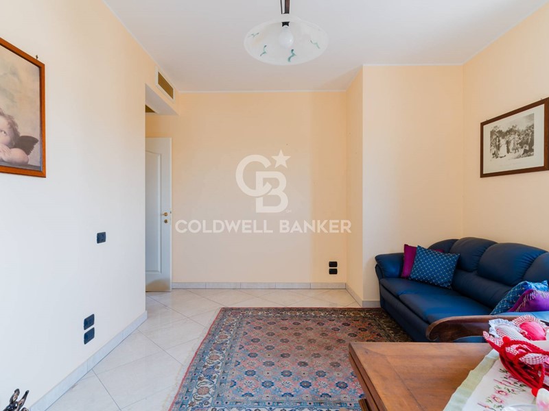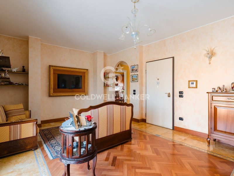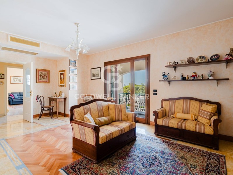 Ingresso su ampia zona living luminosa, con pavimenti in parquet e inserti in marmo di pregio (cornice Siena e marmo azzurro brasiliano a contrasto), elegante e accogliente.