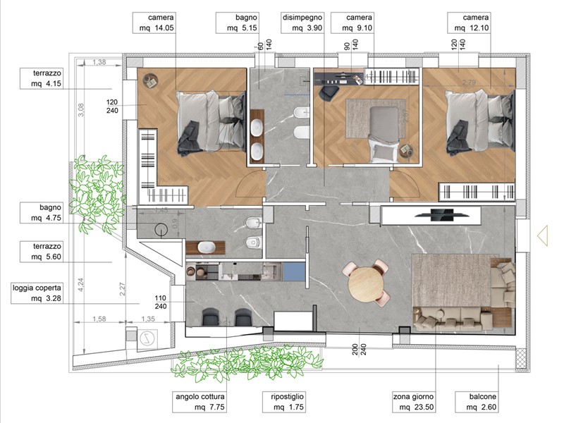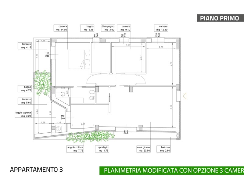 L'immobile offre diverse possibilità di personalizzazione, con la possibilità di realizzare un ampia zona giorno affacciata su terrazzo, tre ampie camere da letto e due sale da bagno, offrendo il massimo confort e privacy.