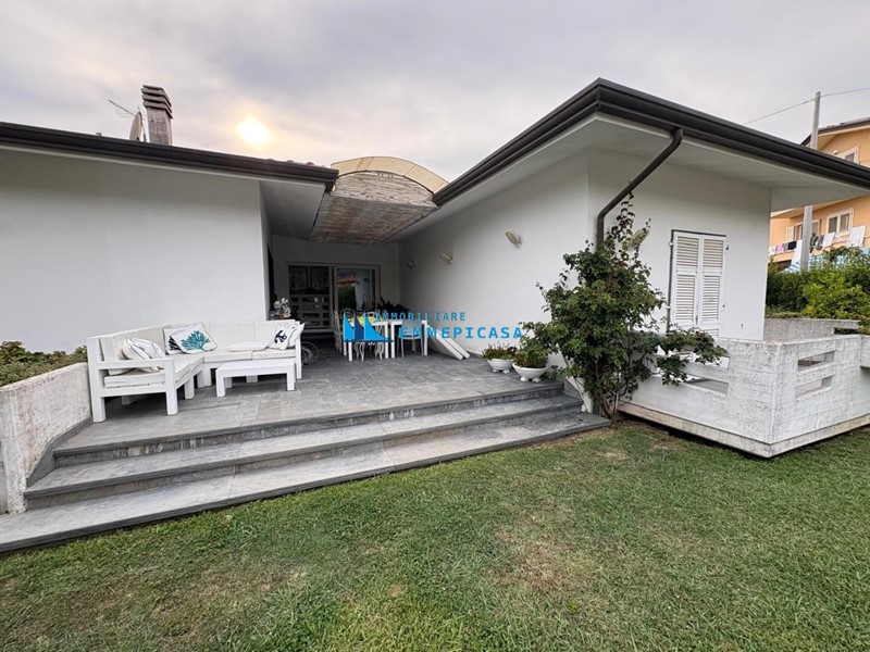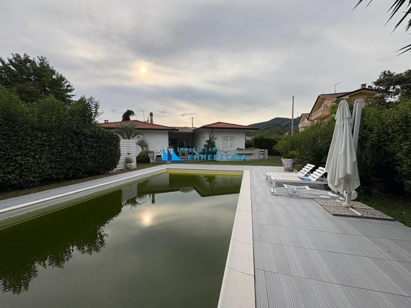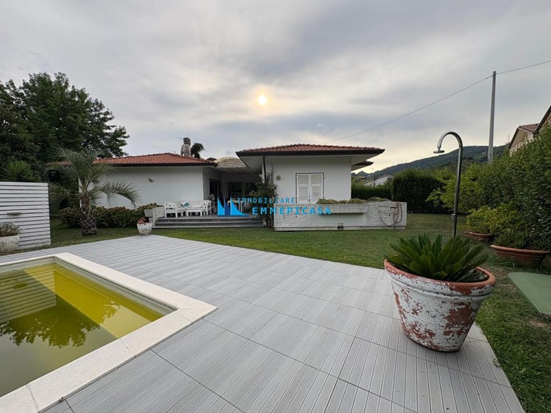Nelle immediate vicinanze del centro di Massa si vende villa con piscina curata nei minimi dettagli. La proprietà si sviluppa tutta la piano terra (oltre taverna al piano seminterrato con accesso da scala interna ed esterna) e si compone di ampio ingresso che conduce a un luminoso soggiorno con grandi vetrate che si affacciano sul giardino e sulla veranda, zona pranzo, cucina abitabile con accesso a portico esterno attrezzato, due bagni e tre spaziose camere matrimoniali. Al piano seminterrato grande taverna con angolo cottura e camino e una cantina ad uso magazzino/lavanderia.