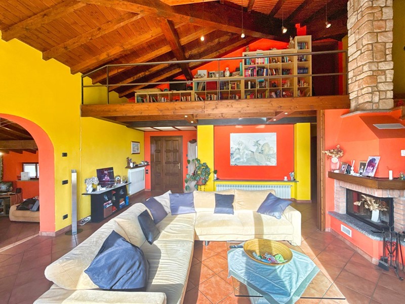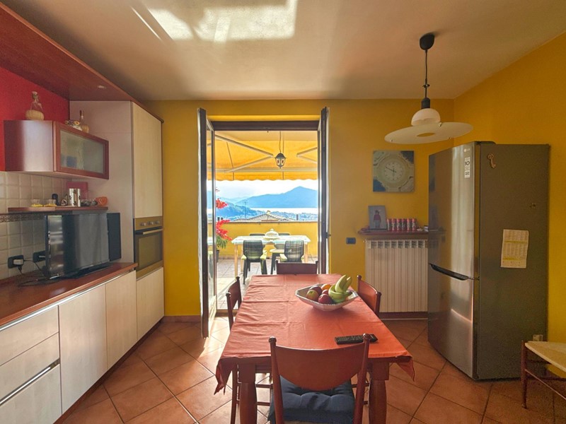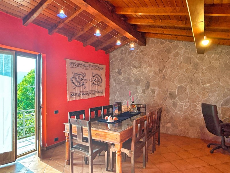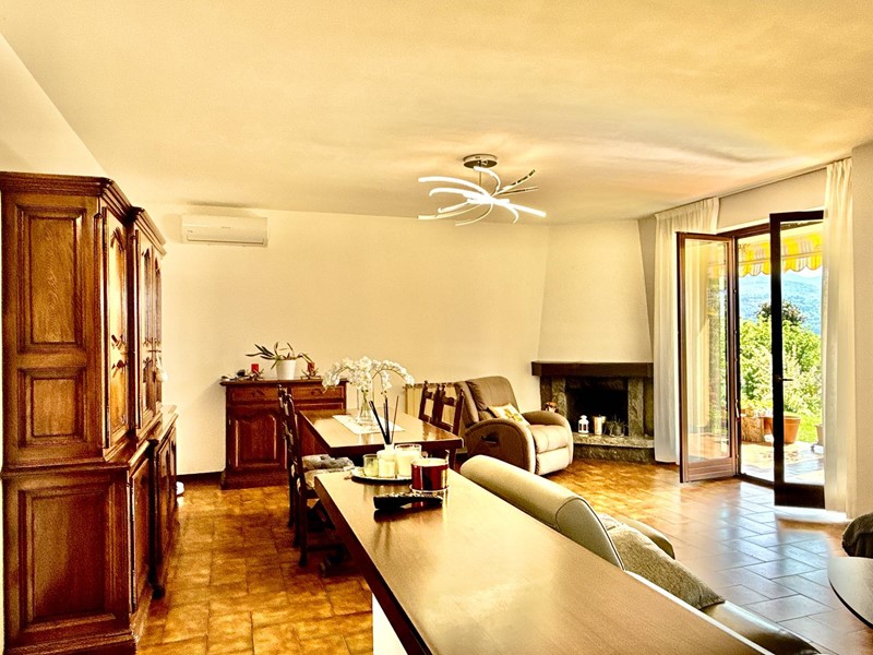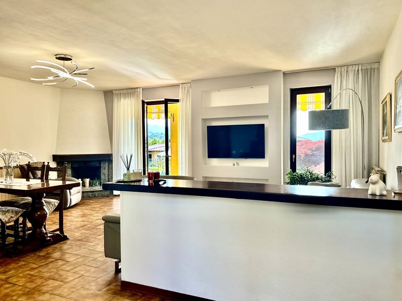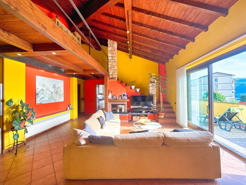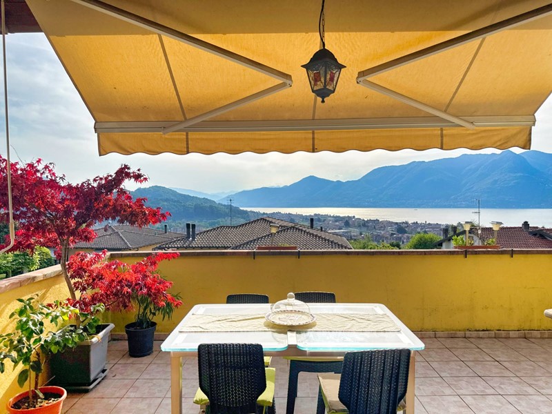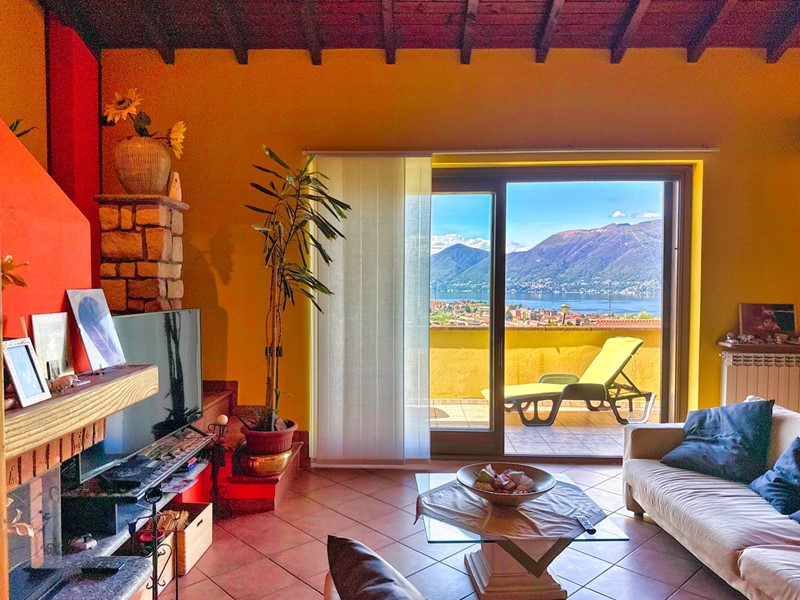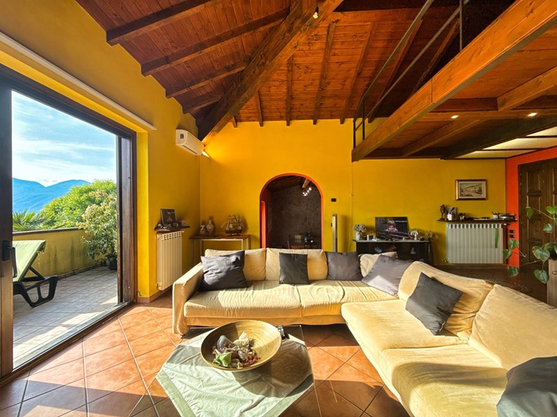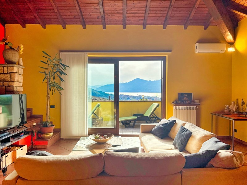 Il piano superiore, accessibile tramite una scala esterna indipendente, accoglie un secondo appartamento che si distingue per la sua zona living calda e accogliente, impreziosita da un elegante camino, un soppalco e travi a vista, il tutto arricchito da una vista panoramica mozzafiato sul Lago Maggiore. La zona giorno include un ampio soggiorno, una cucina abitabile e una zona pranzo, con affacci diretti su balconi di circa 35 mq. La zona notte è composta da due spaziose camere da letto, una cabina armadio e due bagni.