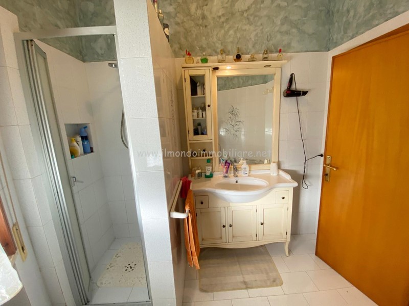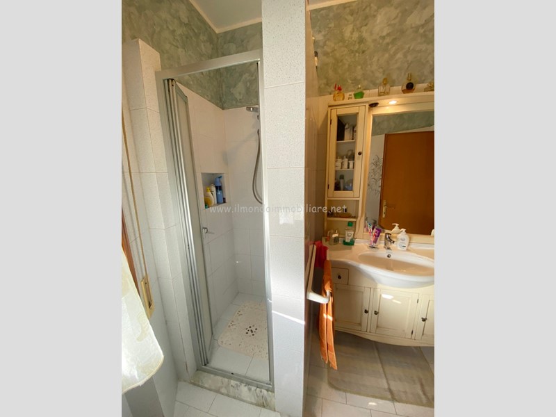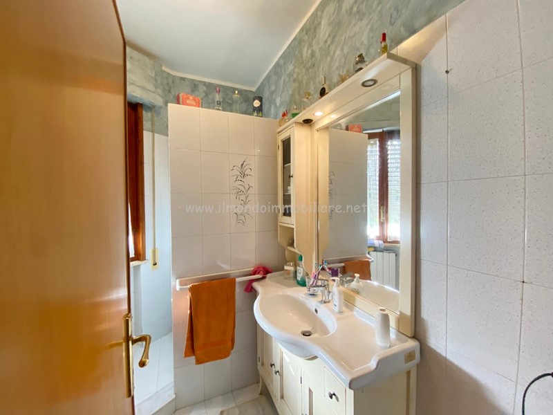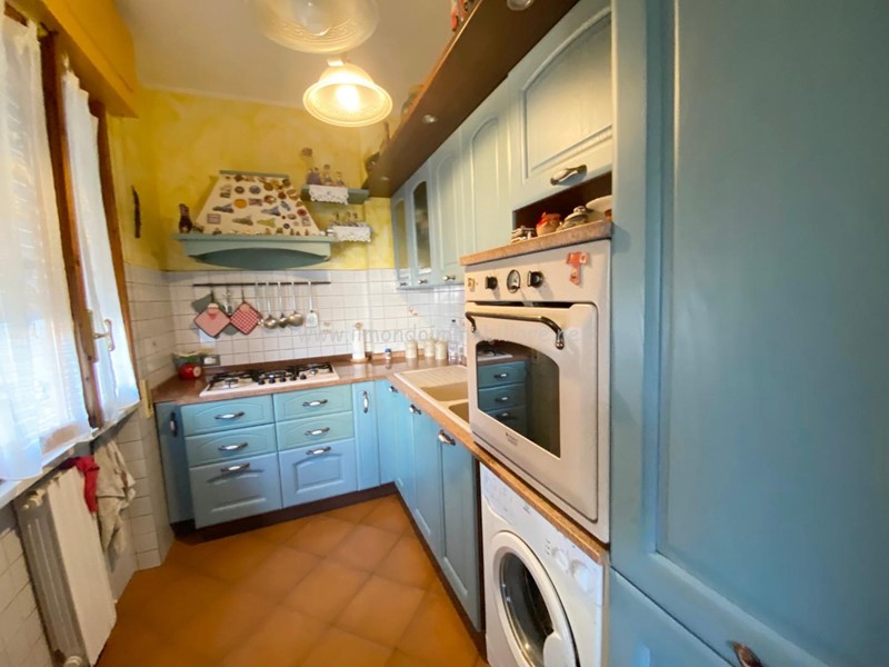 Appartamento al piano rialzato in piccolo condominio, ingresso, soggiorno con balcone e cucinotto, due camere matrimoniali e bagno con doccia e finestra.