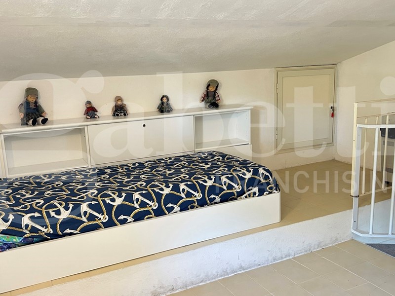 The home, free on three sides, is accessible both by foot and by car thanks to the large outdoor space surrounding the property. The interiors are welcoming and functional: a living room with kitchenette, a double bedroom, a bathroom, and a practical mezzanine level with a second sleeping area. The seafront garden offers beautiful sea views, the perfect setting for relaxing moments.