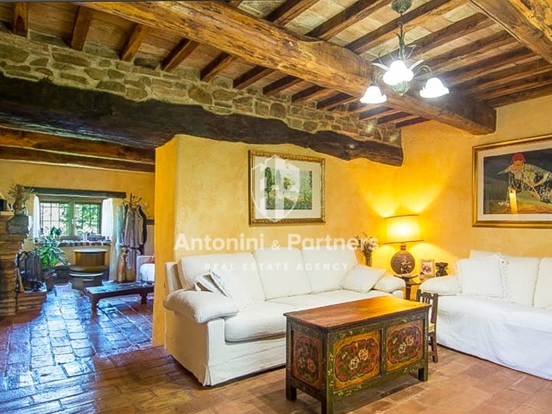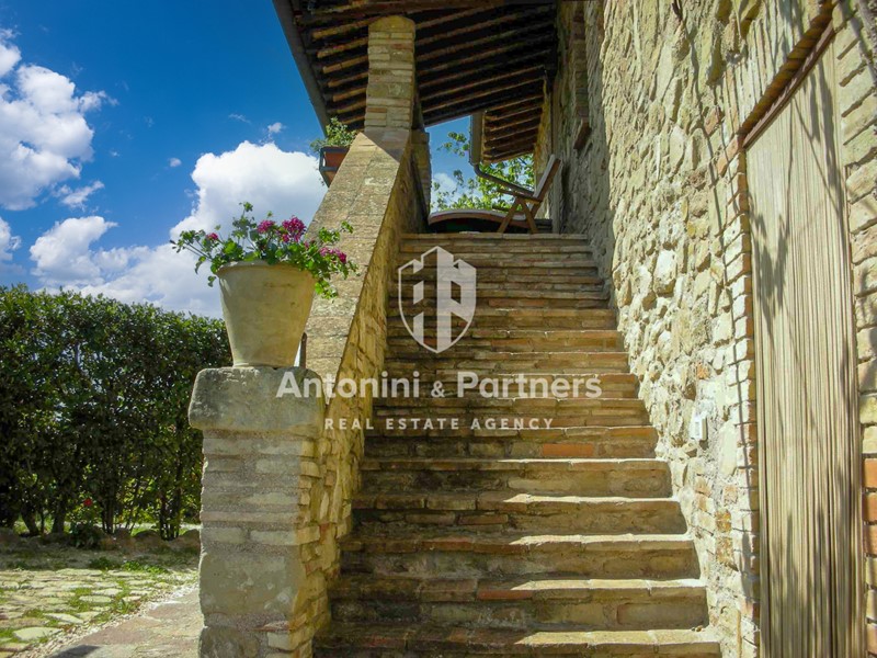 Il casale, completamente restaurato con materiali originali è un manifesto dell'architettura rurale umbra. Esternamente presenta ampie facciate in pietra naturale, un grande porticato e la caratteristica scalinata con ballatoio. Internamente i soffitti sono in travi e pianelle, i camini in pietra e i pavimenti in cotto (nella zona giorno) e in legno (al piano notte).