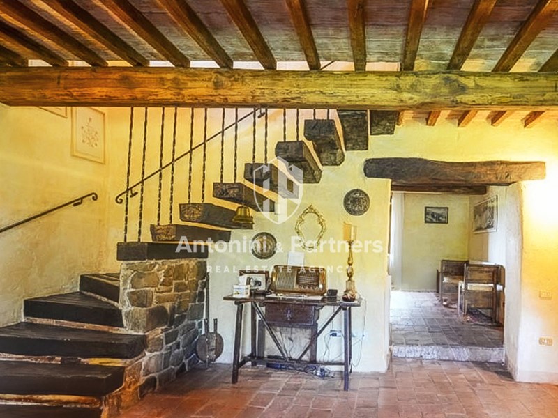 - E un primo piano, servito da due scalinate: la prima interna con gradini in legno e passamani in ferro battuto, la seconda esterna con pianerottolo. Qui si trovano nell'ordine: un elegante soggiorno/studio con camino, un ampio disimpegno, tre ampie camere da letto e due bagni.