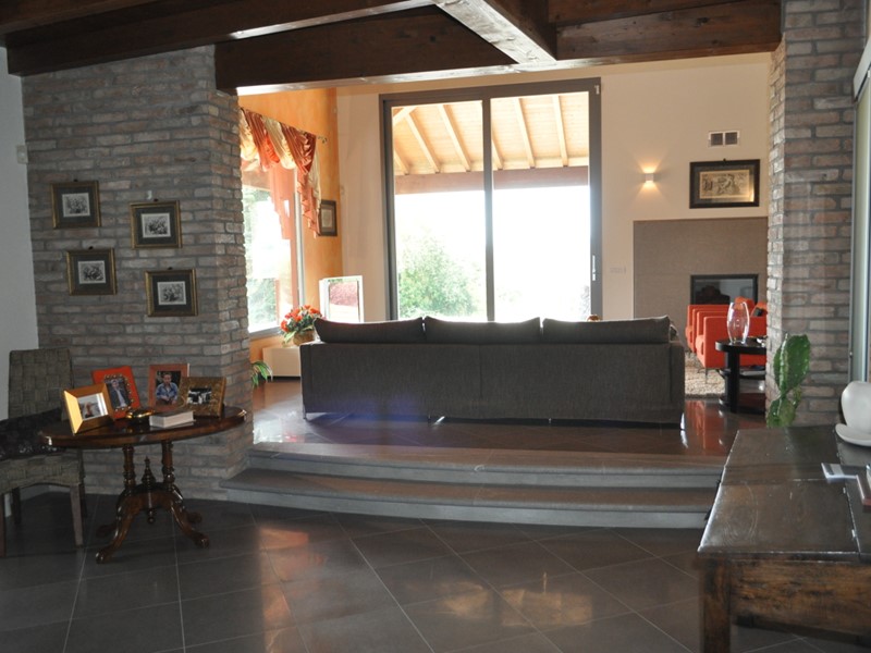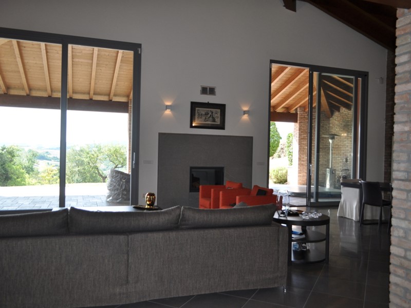 L'immobile è suddiviso su due livelli. Al PIANO TERRA l'ingresso/disimpegno che trasmette da subito la sensazione di una abitazione di alto livello di finiture ed arredi; il salone a doppia altezza con camino e ampie vetrate con affaccio sul porticato e le colline, rendendo l'ambiente luminoso e scenografico. Il porticato si apre sul bel giardino con laghetto a vista sui vigneti e sulla val D'Arda. Il porticato è completato da una vasca idromassaggio jacuzzi esterna.