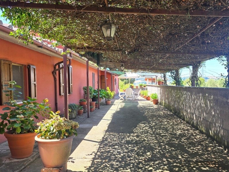 Al piano terra troviamo un soggiorno molto ampio con un camino centrale e travi in legno a vista, una cucina con camino, un secondo ampio soggiorno con camino, una terza stanza molto grande (attualmente addebita a camera da letto), su questo piano troviamo anche due bagni, una dispensa e un garage di 72mq (trasformabile in zona abitabile). Il primo piano ospita la zona notte con tre camere matrimoniali, uno studio, un ampio bagno e un ripostiglio. Finestre e portelloni in legno di castagno, zanzariere, acqua dell'acquedotto, pozzo, riscaldamento con termosifoni, caldaia a gas, bombolone di GPL. Completa la proprietà un altro garage di 81mq nel seminterrato.