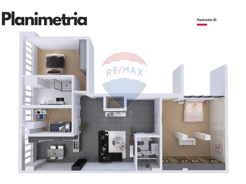 È così composto: ingresso, cucina e grande living, tre camere matrimoniali due bagni.
