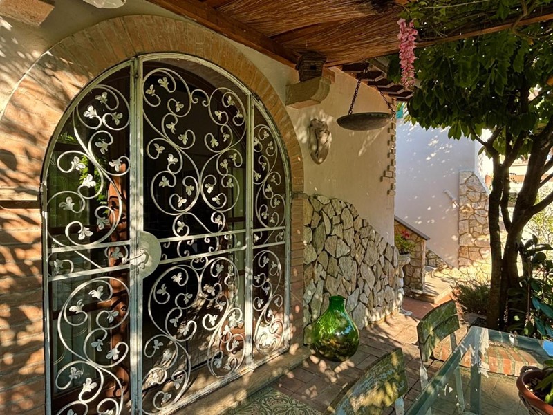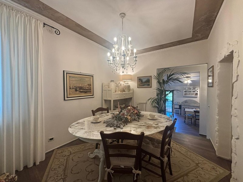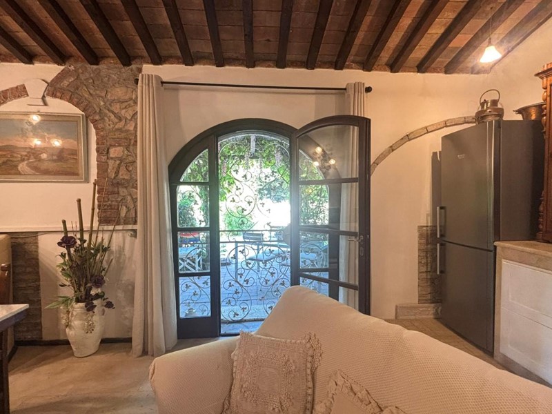 Le eleganti porte finestre offrono una piacevole vista sul giardino circostante e permettono l'accesso al portico sempreverde, dove si trova anche un'area barbecue, con un bellissimo ed antico forno toscano per godere momenti conviviali e di relax all'aria aperta e al riparo dal sole.