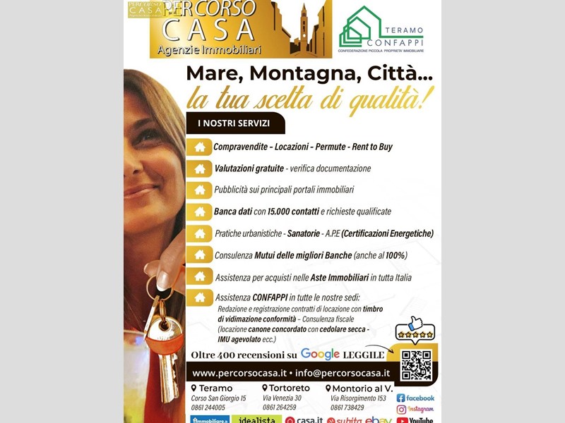 Per ottenere maggiori informazioni per questo CASA INDIPENDENTE PANORAMICA in VENDITA a TERAMO (RIF. V4161A) potete contattarci al numero 0861 244 005 oppure visitare la nostra Agenzia in Corso San Giorgio n. 15.