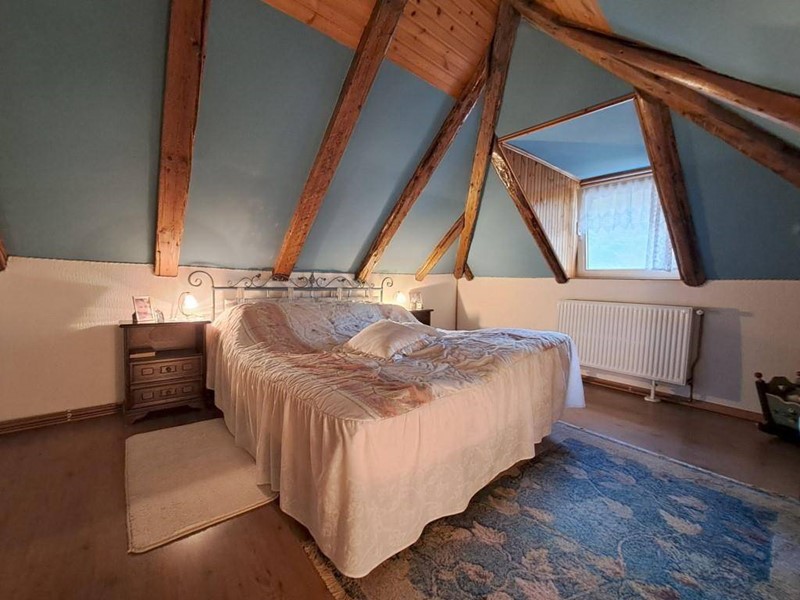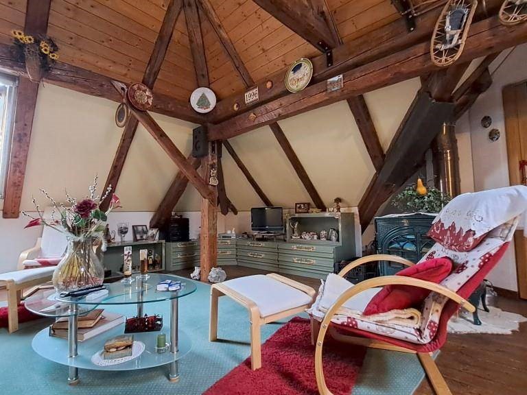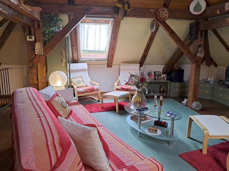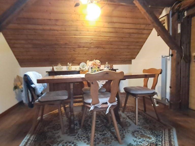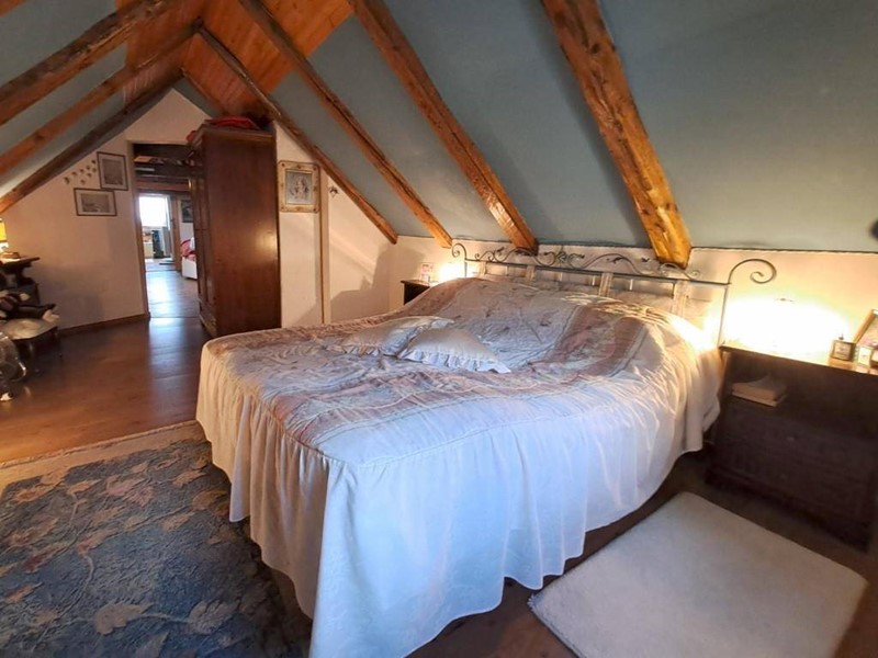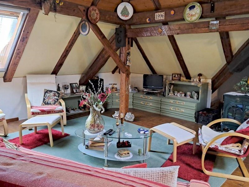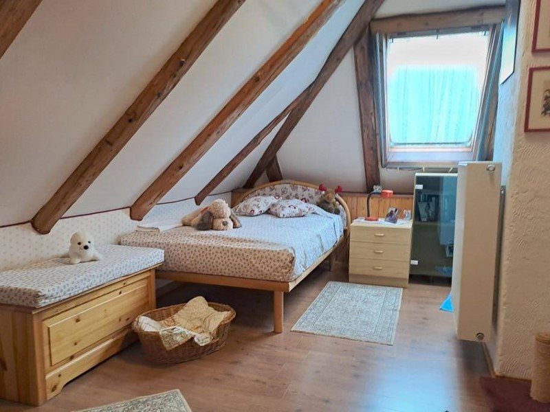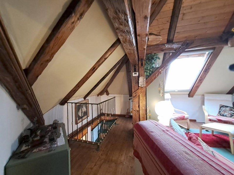 In zona tranquilla e immersa nel verde in palazzina di poche unità abitative, appartamento termoautonomo e pertinenziale area di terreno in proprietà esclusiva. Posto su due livelli si compone al primo piano da ingresso, zona giorno/cucina con particolare angolo cottura realizzato in muratura, la stufa a legna e con finestra che si affaccia sullo spazio verde esterno; dall'ingresso si accede inoltre al bagno finestrato e dotato di box doccia e quindi alla scala che dà accesso all'ampia stanza mansardata e con travi a vista al piano sottotetto e alle due soffitte. Completa inoltre la proprietà il ripostiglio/legnaia posta al piano terra. Il posto auto è condominiale esterno. Spese di condominio contenute.