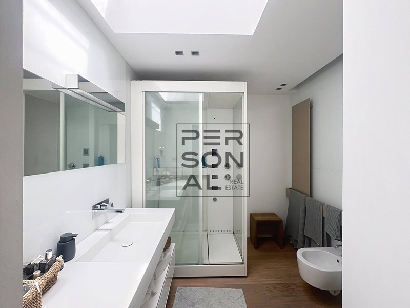Salendo al piano superiore, troviamo una moderna CUCINA CON ISOLA CENTRALE, dotata anche di cantina frigo. Questo piano ospita anche un secondo bagno, perfetto per gli ospiti o a servizio della vera protagonista dellimmobile: una SPETTACOLARE TERRAZZA DI 89 MQ.