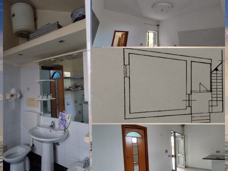 La parete della cucina è provvista di mattonelle e agganci per l'acqua. Un tavolo in marmo separa l'ingresso dal locale. Un finestrone gigante motorizzato porta luce dal soffitto. Quest'ultimo è provvisto di controsoffitto ornamentale con luce e faretti. Il bagno ha una finestra che affaccia nel cortile in comune che ospita alte 3 famiglie in case limitrofe. Il riscaldamento attualmente è fornito da una caldaia, ma all'esterno è già previsto eventuale montaggio per caldaia a gas (da richiedere solo la tubatura del gas già presente fronte strada)