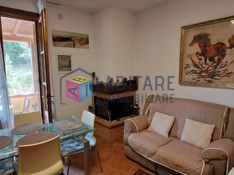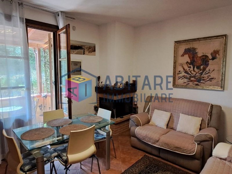 Vendesi villetta a schiera di 70 mq, finemente rifinita, composta da un soggiorno con camino e pavimenti in gres, cucina separata, e un reparto notte con una camera matrimoniale, una camerina, un bagno e un ripostiglio, tutti in parquet. Al piano inferiore si trovano un garage e un box auto per il parcheggio dell'auto. Completa la proprietà un giardino di circa 350 mq, ideale per momenti di relax e attività all'aperto.