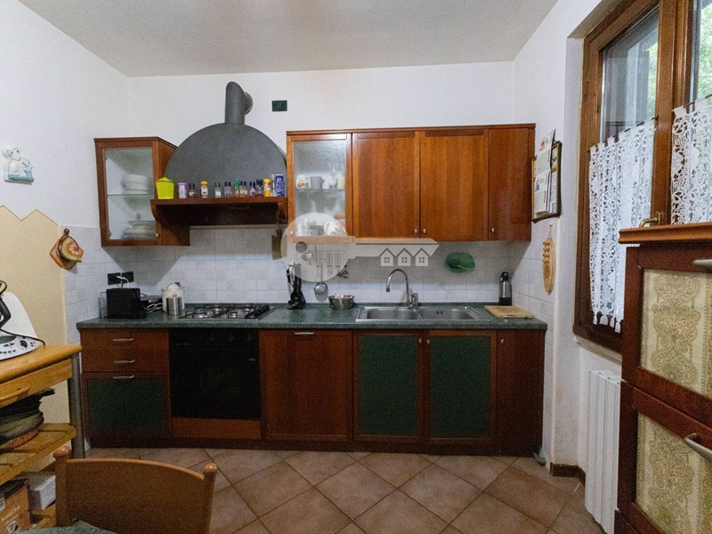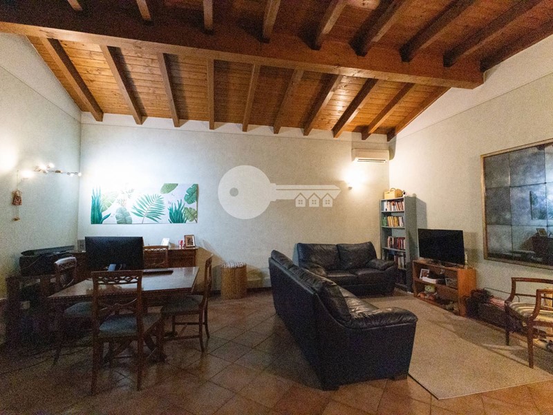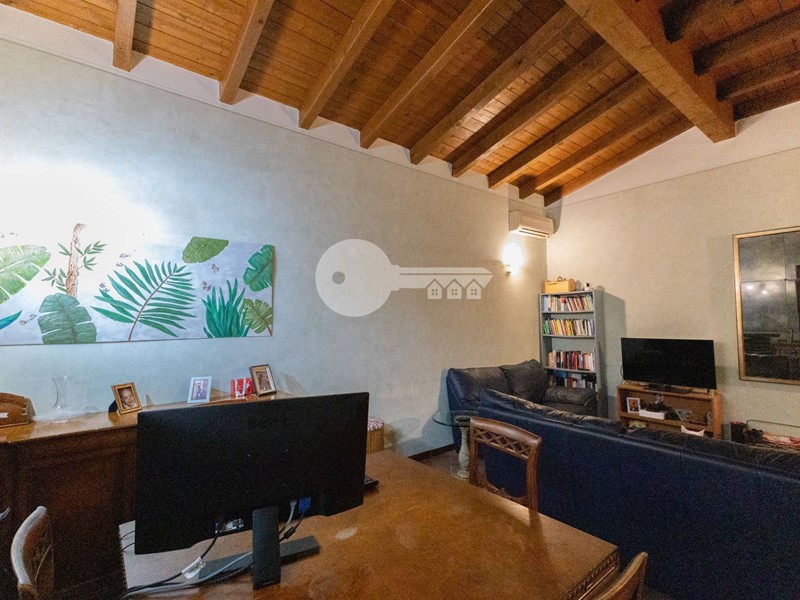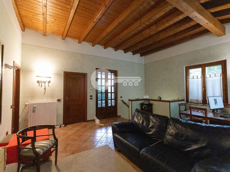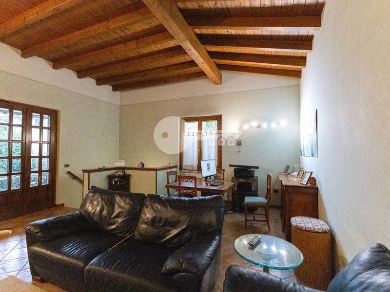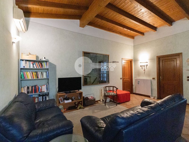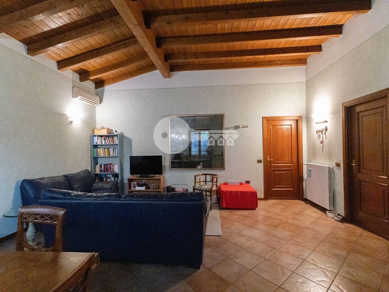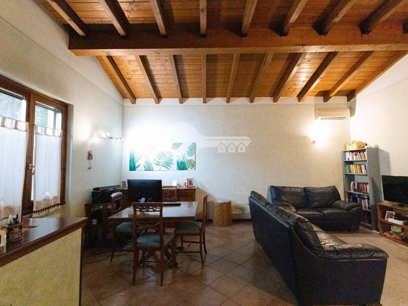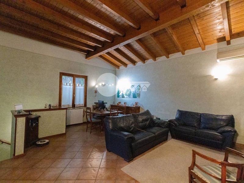 La zona giorno è impreziosita dalle travi a vista che conferiscono calore e carattere agli ambienti.