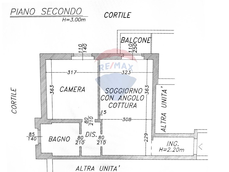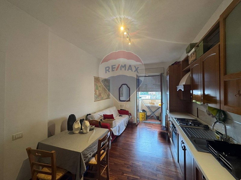 La disposizione interna prevede un ingresso, un soggiorno con cucina a vista, una camera matrimoniale, un bagno finestrato con vasca, un balcone e un ripostiglio aereo.