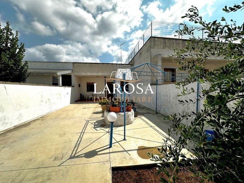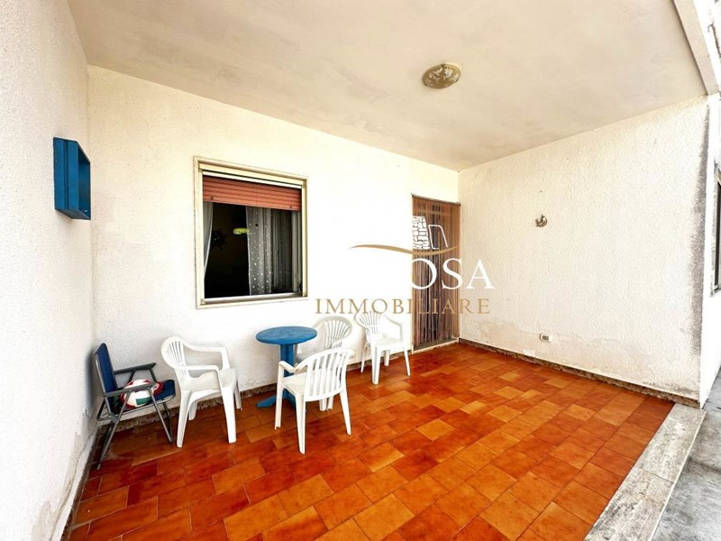 La parte antistante si presenta con un ampio villino antistante di circa 60 mq, pavimentato, recintato con muretto e ringhiera in ferro, e veranda coperta. Il portoncino d’ingresso in alluminio e vetro conduce direttamente all’interno dell’abitazione.