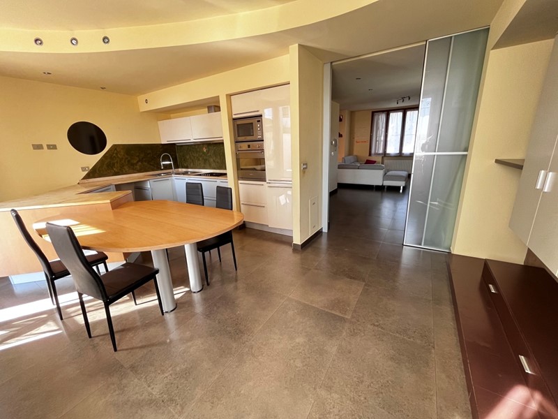 L’ingresso principale apre su un ampio e luminoso soggiorno, separato da una porta vetrata dalla cucina abitabile. Quest’ultima, date le generose dimensioni, comprende anche una zona pranzo. La cucina è rifinita con top in marmo e isola/tavolo in legno. Da qui si accede a un terrazzo di 30 mq, ideale per pranzi all’aperto o momenti di relax, grazie all’ottima esposizione sud-est.