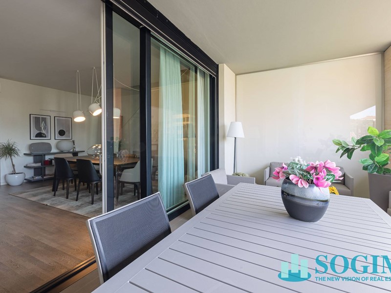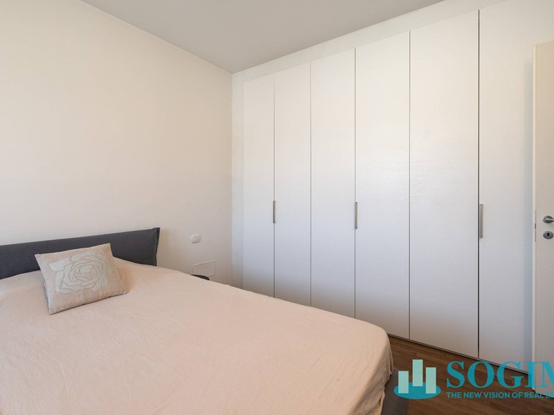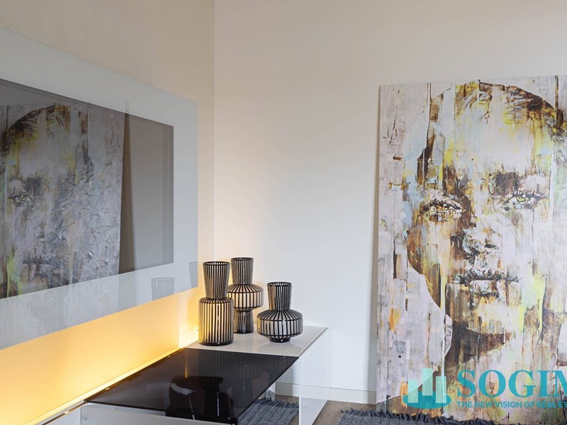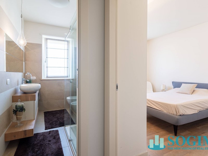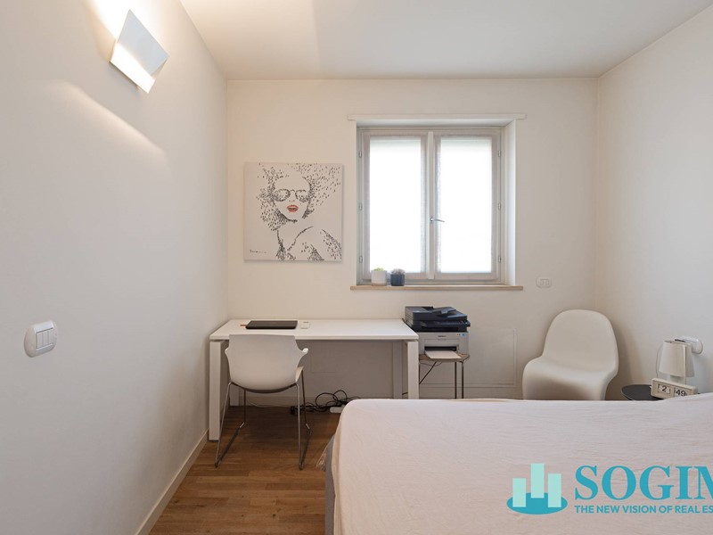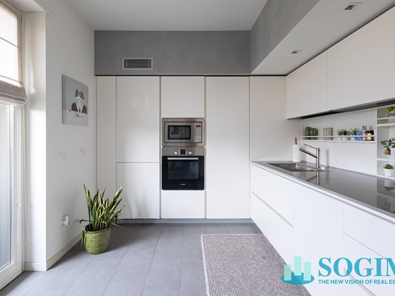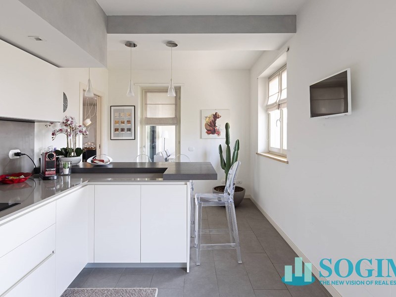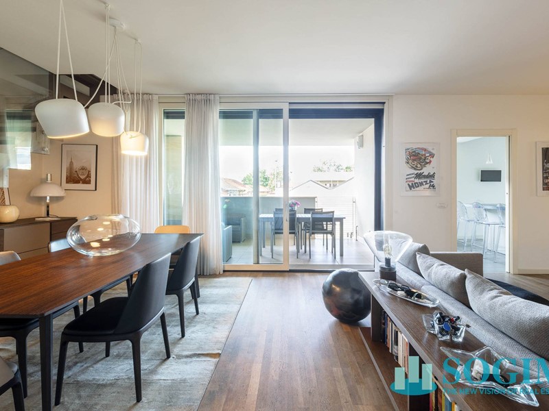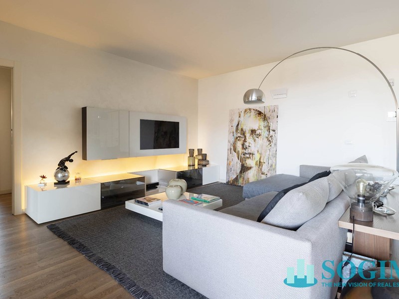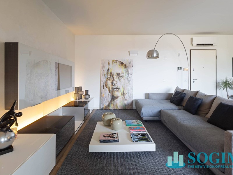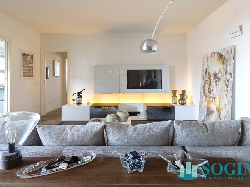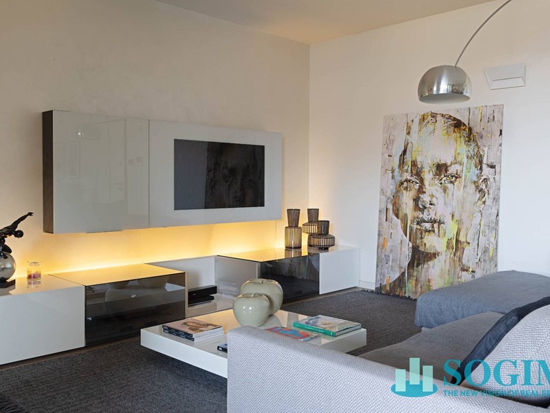 Lappartamento è completamente arredato con mobili di design Poliform, cucina Varenna e illuminazione Flos.