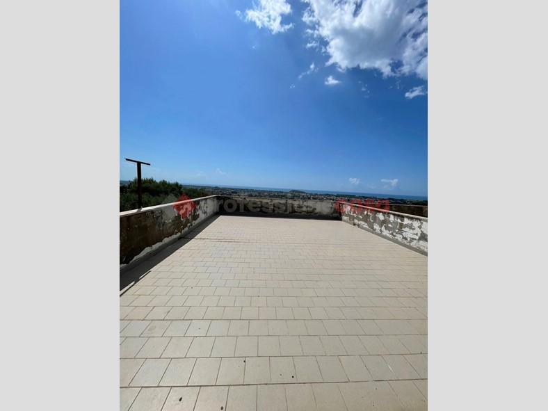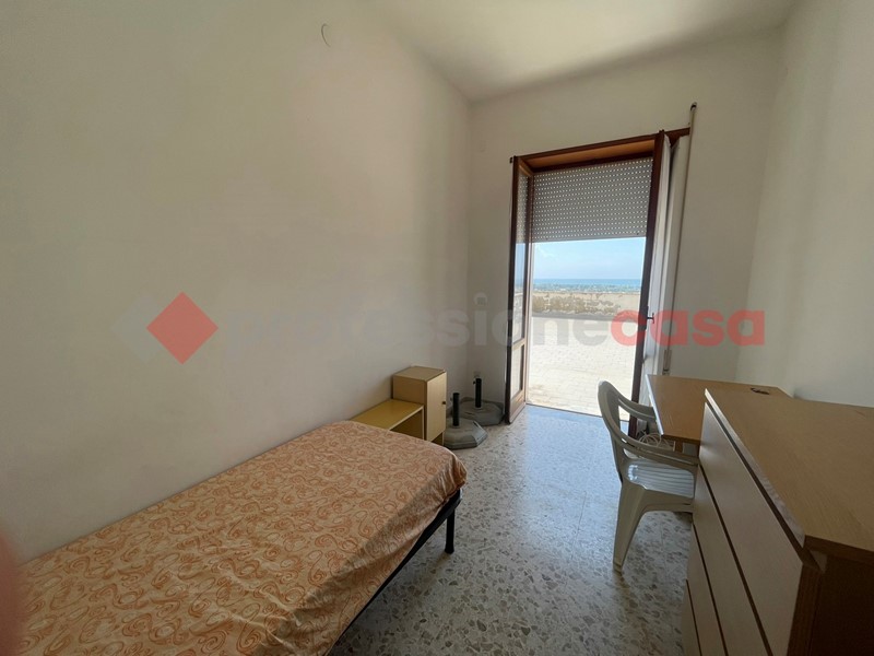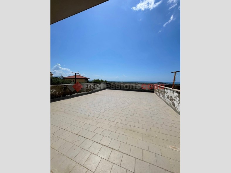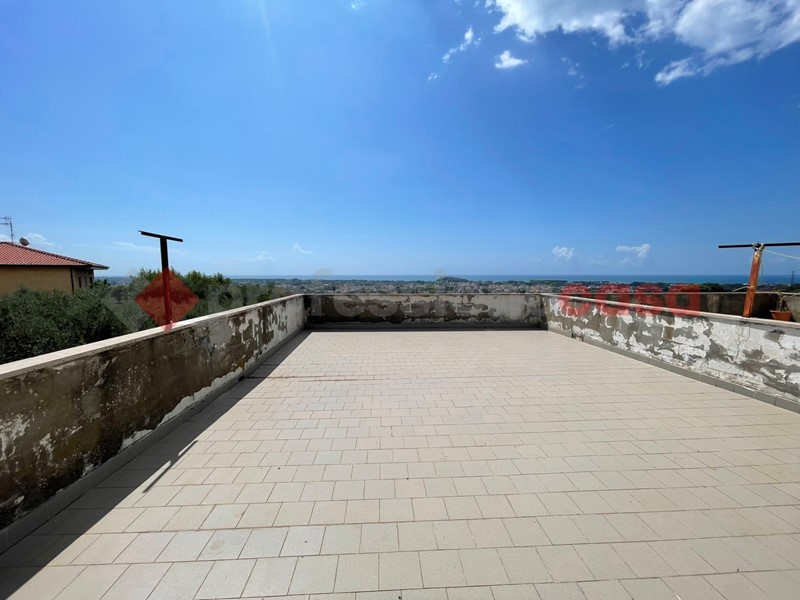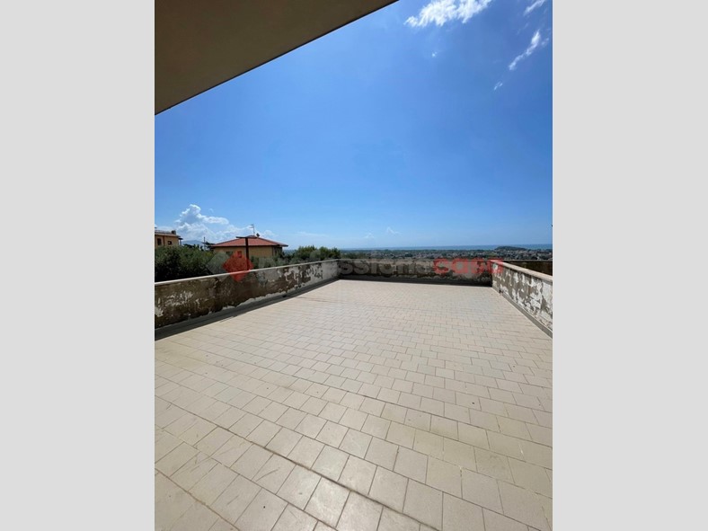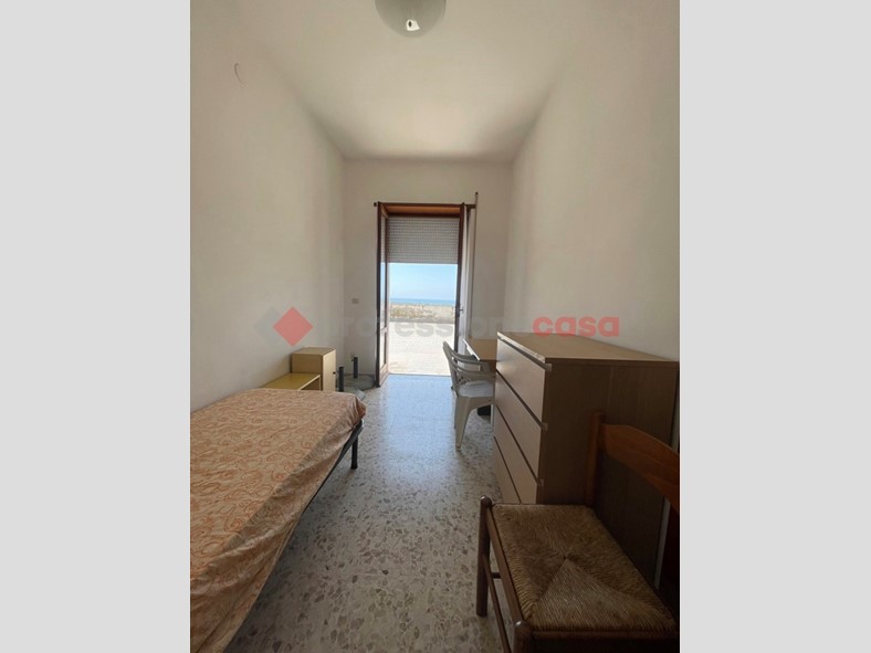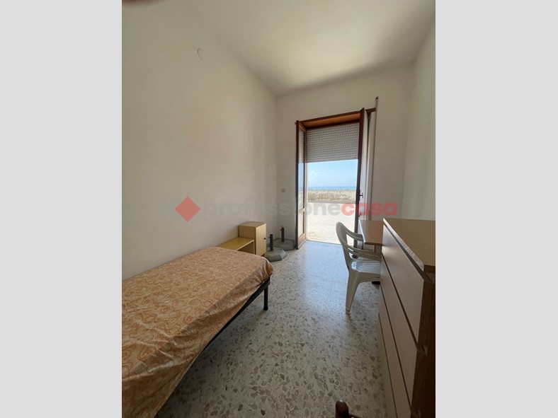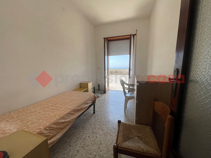L'appartamento, in buone condizioni interne, è composto da un ampio corridoio, cucina abitabile, bagno, una camera da letto matrimoniale e una cameretta, entrambe con accesso diretto al terrazzo a livello, panoramico di 40 mq con vista mare.