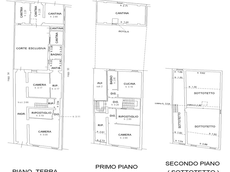 120 mq il piano terra, 90 mq il primo piano, 100 mq il sottotetto, più corte interna e servizi posteriori.