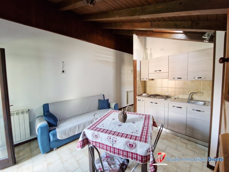 Proponiamo in vendita appartamento sito al terzo piano, composto da soggiorno con angolo cottura, una camera, disimpegno, bagno, ampio ripostiglio sottotetto basso e balcone. Completa l'interessante soluzione il garage.\n\n