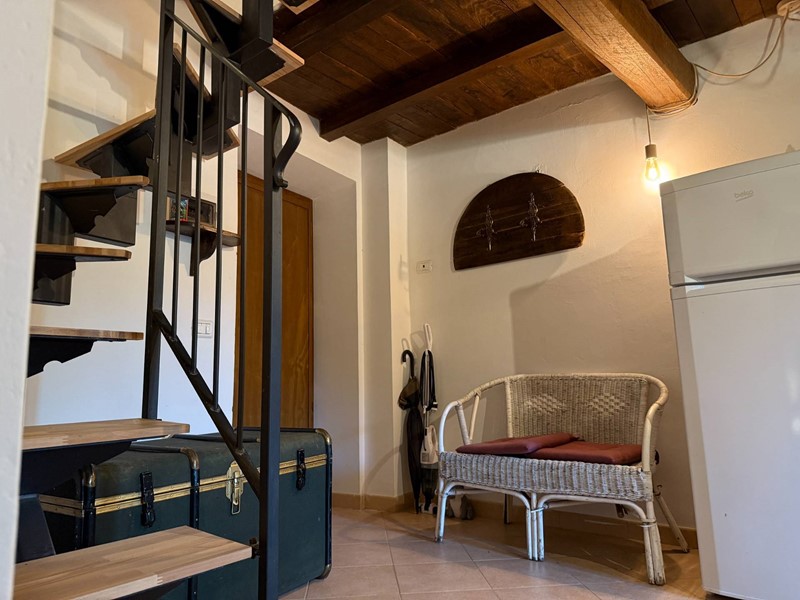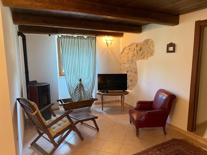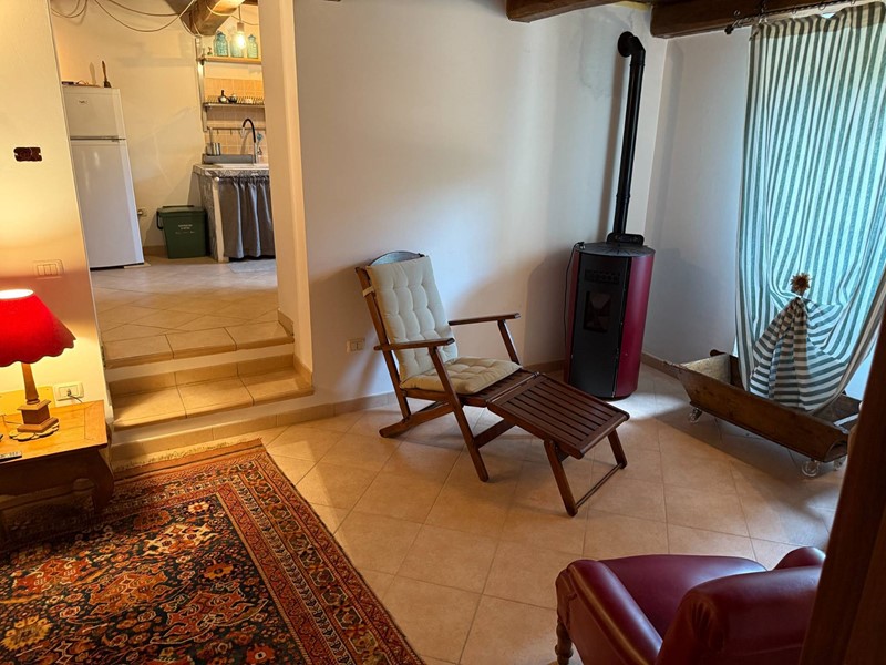 Labitazione, di circa 60 mq con ingresso indipendente, si compone al piano rialzato da cucina con angolo cottura in muratura e piano a induzione, accogliente soggiorno con parete in pietra a vista e stufa a pellet, e una camera da letto matrimoniale