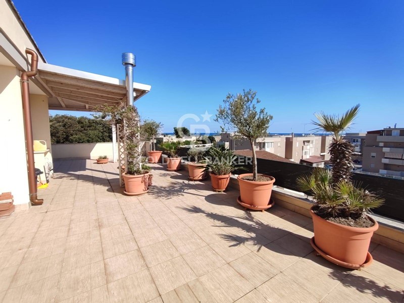 In the quiet and sought-after area of Materdomini, we offer for sale a wonderful renovated penthouse with a garage and 360° sea views. With its 117 sq m interior and a three-sided exposure encompassing a 240 sq m terrace, the property offers breathtaking sea views that enchant at any time of day. The elevator with direct access to the apartment welcomes you into an oasis of tranquility and luxury. The property opens onto an elegant corridor that leads to a bright living area, perfect for moments of relaxation and conviviality; Here you'll find a living room, a functional kitchen, and a guest bathroom. The cleverly separated sleeping area consists of two bedrooms and a second bathroom. Comfort is also guaranteed by the presence of a private 20 sq m garage, an invaluable convenience in this area. Conveniently located, the penthouse is in a well-served residential area, just a short walk from the Materdomini beaches and the picturesque Marina. The proximity to public transport makes every trip quick and easy. A Coldwell Banker Exclusive. Contact our agency for more information or to schedule a viewing.
