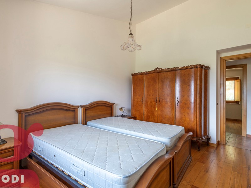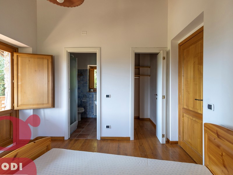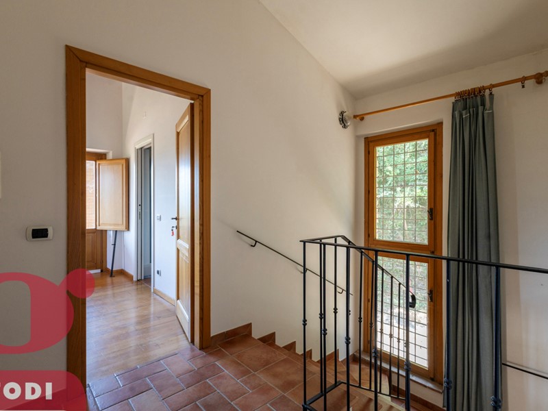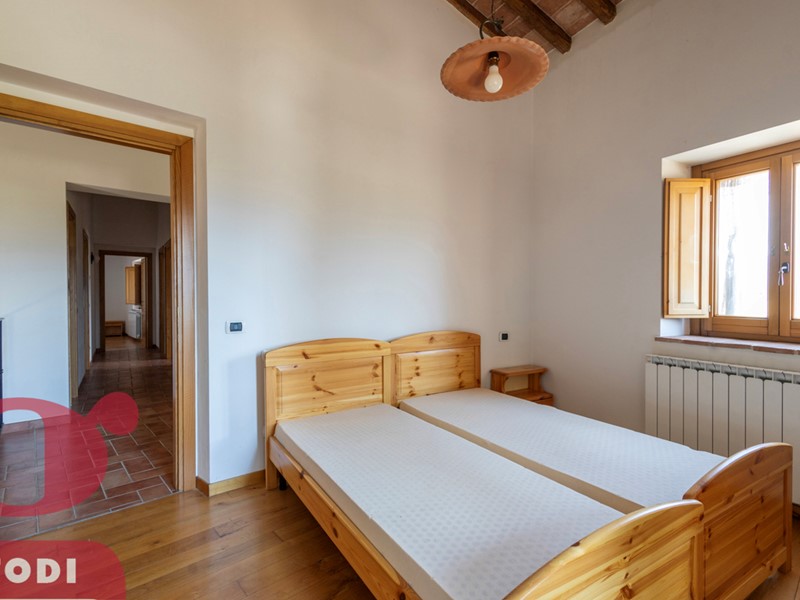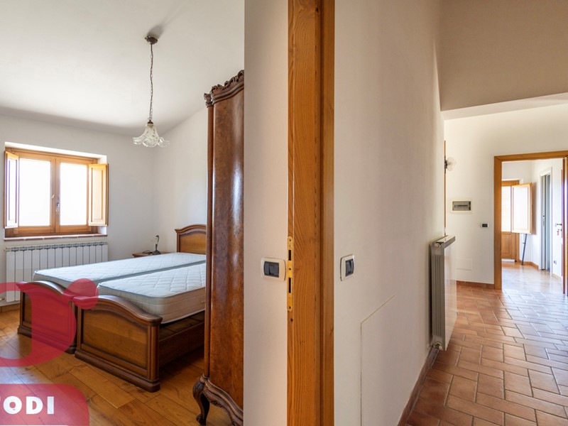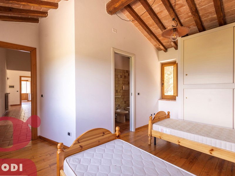 Salendo invece al piano primo si trova la zona notte, composta da: una camera da letto matrimoniale con guardaroba, bagno en suite ed affaccio su una fantastica veranda di 10 mq con vista a perdita d'occhio sui campi ed i Monti Martani all'orizzonte; un'altra camera matrimoniale con bagno en suite; una terza matrimoniale con guardaroba e bagno contiguo; una quarta matrimoniale, sempre con bagno immediatamente adiacente. Si ha quindi a disposizione su questo livello un totale di ben quattro camere matrimoniali e quattro bagni, oltre ad un ampio ripostiglio che può essere utilizzato anche come studio o come camera extra provvisoria.