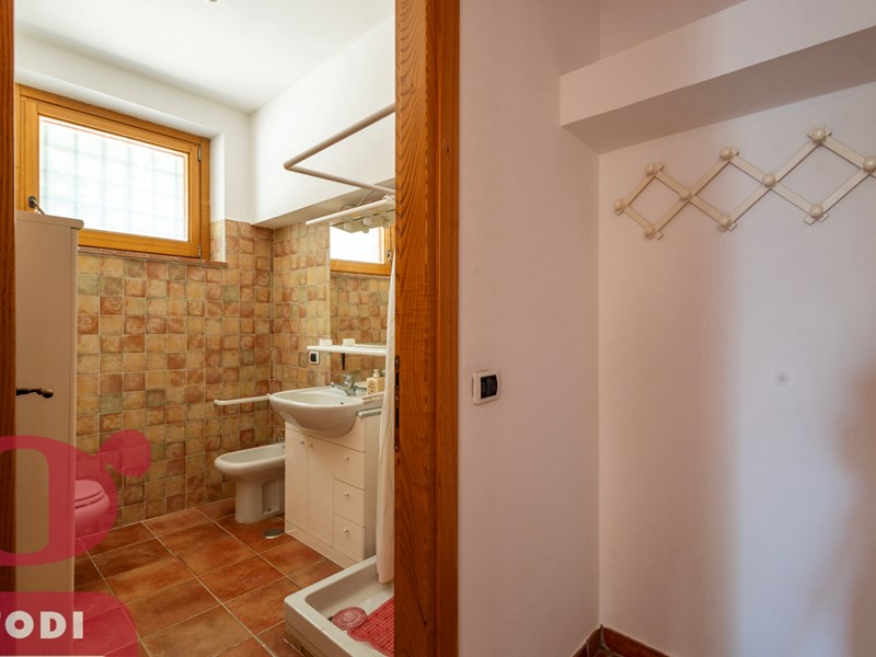 Troviamo al piano terra la zona giorno, composta da un ampio ingresso che disimpegna il generoso soggiorno dal pratico bagno di servizio finestrato con doccia, dalla luminosa sala da pranzo e dalla grande cucina abitabile con mobilio in legno chiaro e piani di lavoro e penisola in muratura. La cucina è direttamente comunicante con una comoda dispensa ed una zona lavanderia. Nota unica, nel living è presente una caratteristica stufa a legna in maiolica, con meraviglioso rivestimento in ceramica smaltata di uno scintillante verde bottiglia.