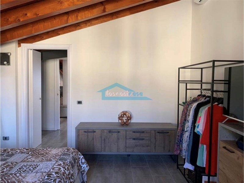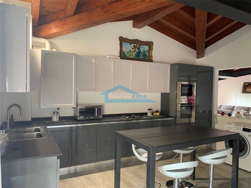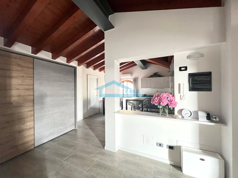 L'interno di questa casa è uno spazio ampio e arioso, arricchito da spettacolari travi a vista in legno lamellare che conferiscono un fascino unico. L'attico si compone di un luminoso ingresso, un grande salone open-space, con angolo cucina abitabile e due disimpegni separati uno per accedere alla camera padronale con bagno e l'altro all'ampia stanza jolly illuminata dal lucernario e col secondo bagno/lavanderia.