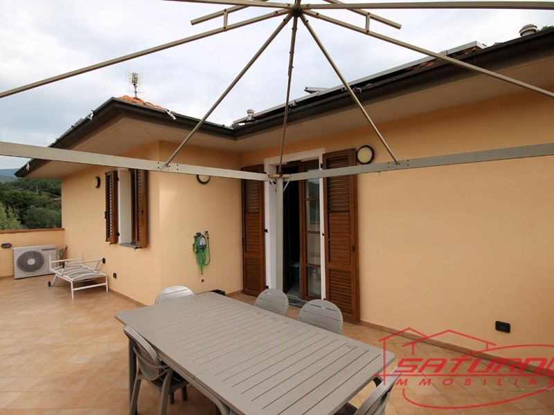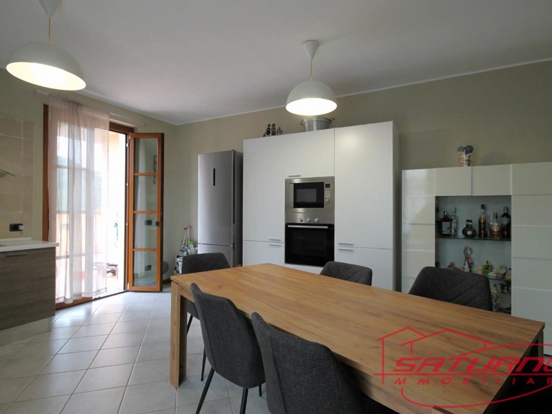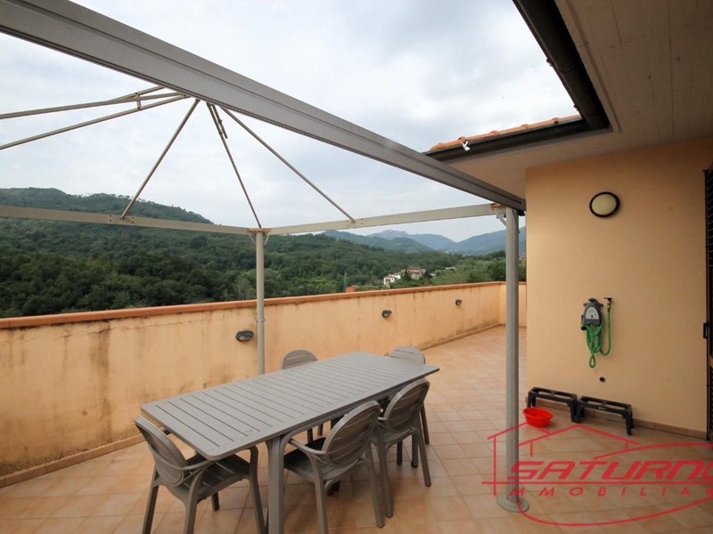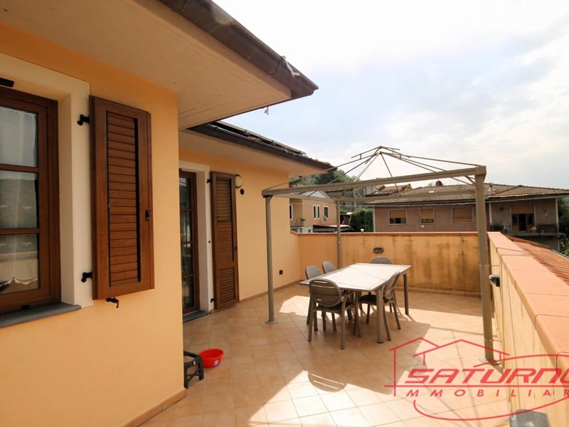 (Rif. 3326) DOMAZZANO Ubicato in piccolo fabbricato di recente costruzione diviso in sole 4 unità immobiliari, appartamento al primo e ultimo piano di 110 mq. composto da: ingresso in ampio soggiorno open space con angolo cottura con affaccio a terrazza panoramica di 50 mq. (completamente esposta a sud) e secondo terrazzo in zona giorno. Disimpegno notte, camera matrimoniale con terzo terrazzo, camera media, camera singola e due bagni entrambi finestrati in zona notte. Corredato da posto auto coperto e zona ripostiglio in ampio locale autorimessa in comune con le altre unità. Ottime sono le condizioni di manutenzione da subito abitabile: portoncino blindato, infissi in pvc con doppi vetri, impianto di riscaldamento a pavimento, pannelli solari, aria condizionata e impianto di allarme. L'immobile viene venduto completamente arredato come da foto. C.E.:F EPgl: 184,51 kwh/m2anno.