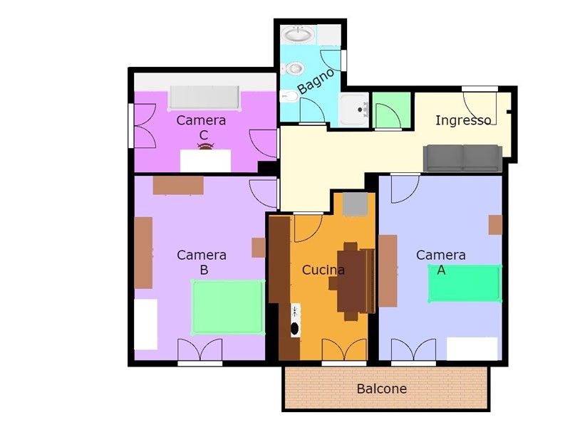 Internamente abbiamo un bell'ingresso con divano, 3 camere da letto ad uso singola, una ampia cucina abitabile con poggiolo, un capiente ripostiglio ed un bagno ampio completo con doccia.
